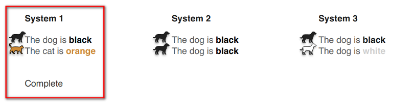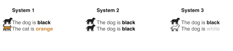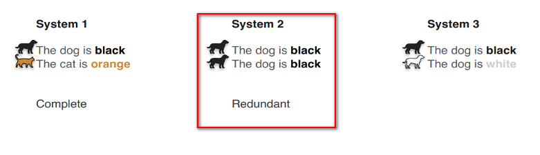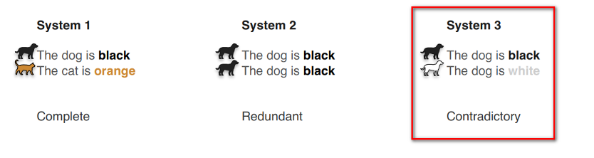 Hệ thống này được gọi là contradictory system vì con chó không thể vừa đen vừa trắng cùng một lúc, hãy nhớ rằng chúng ta có một con chó và nó chỉ có thể có một màu.
