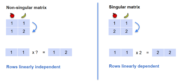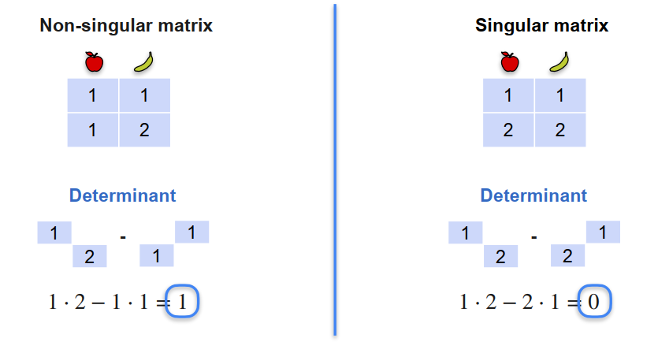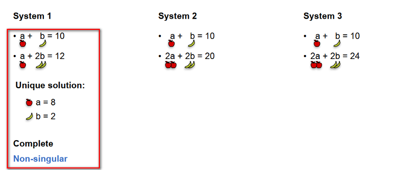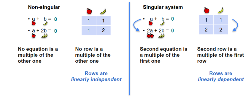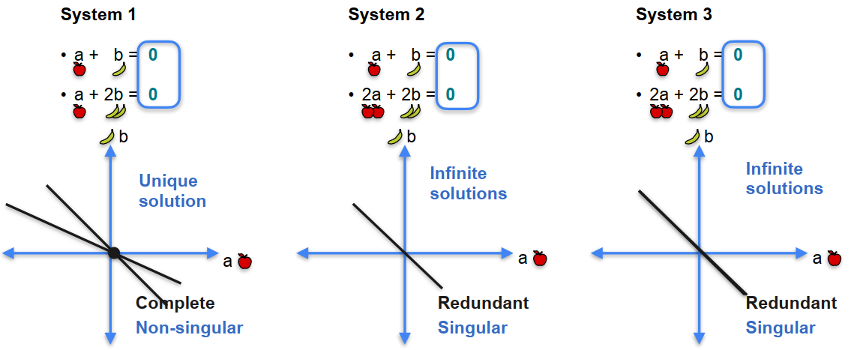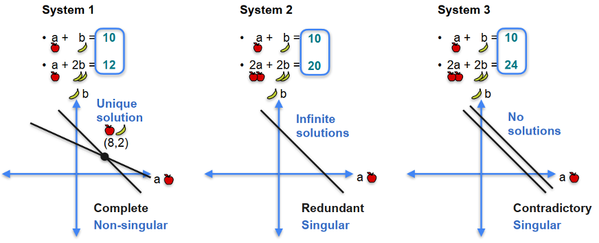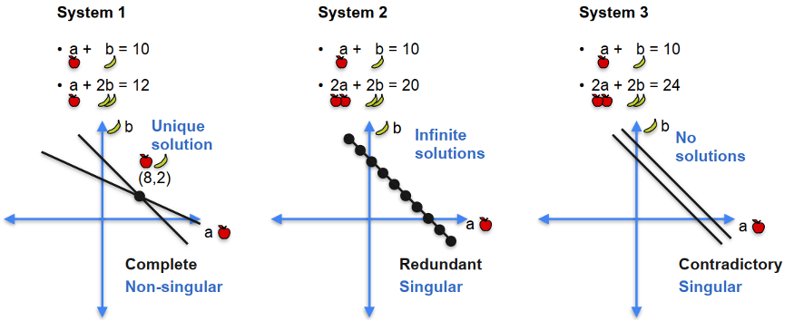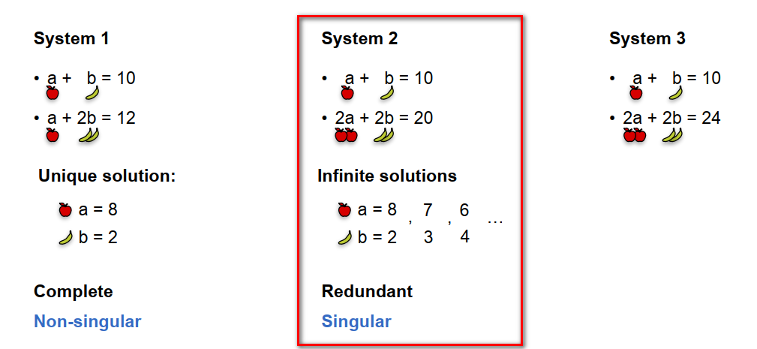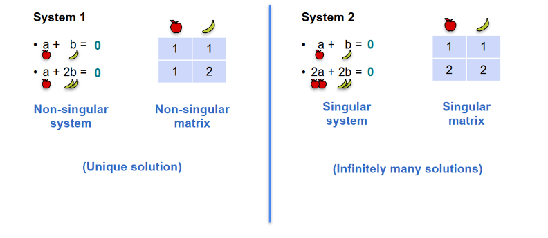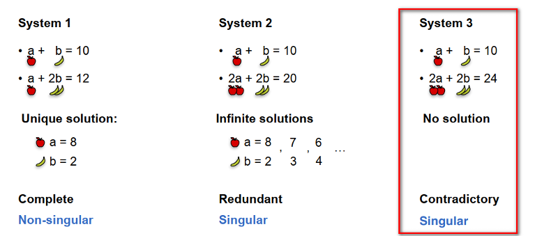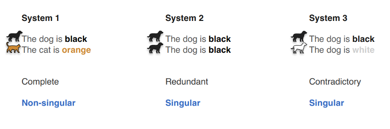 Non-singular: hệ có nghiệm duy nhất (complete system). Singular: hệ có vô số nghiệm (redundant system) hoặc hệ vô nghiệm (contradictory).