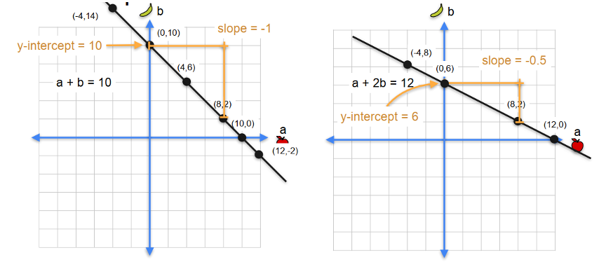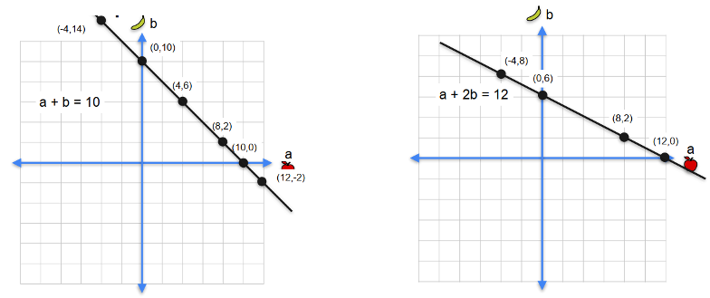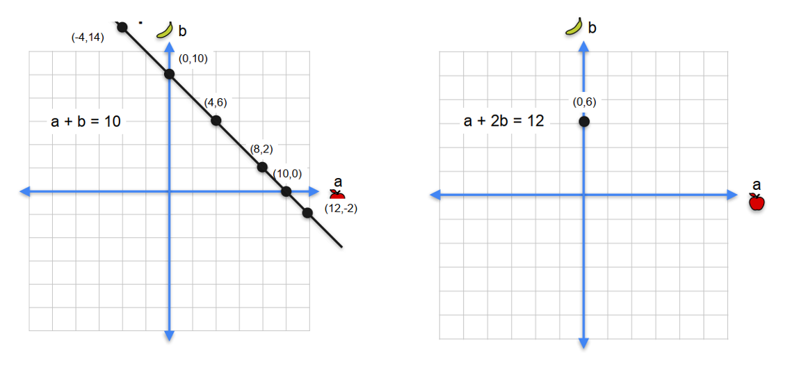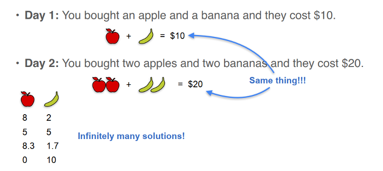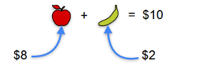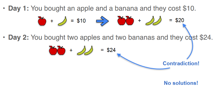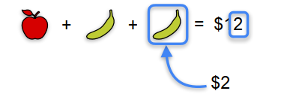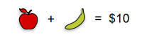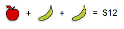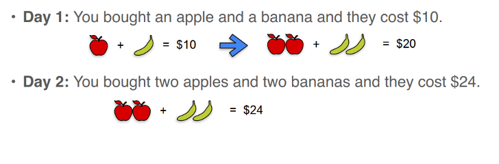 - Day 2: You bought an apple and two bananas and they cost $12.