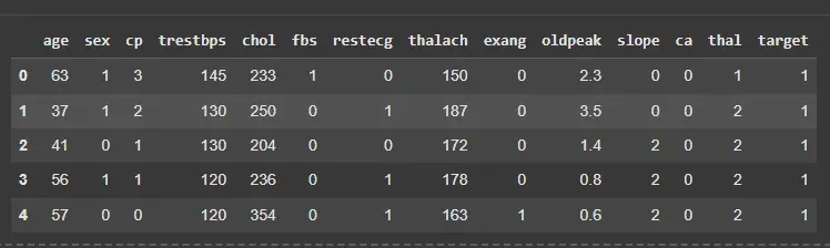 - df[‘target’]: Selects the target variable for prediction. df.head(): Displays the first 5 rows of the dataset.