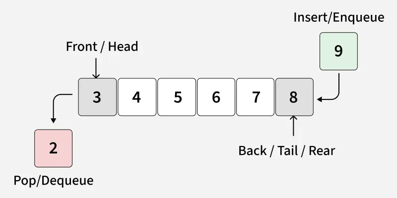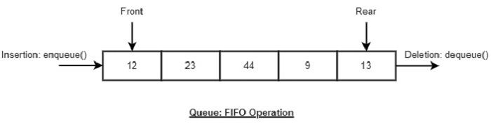 Front: Position of the entry in a queue ready to be served, that is, the first entry that will be removed from the queue, is called the front of the queue. It is also referred as the head of the queue.