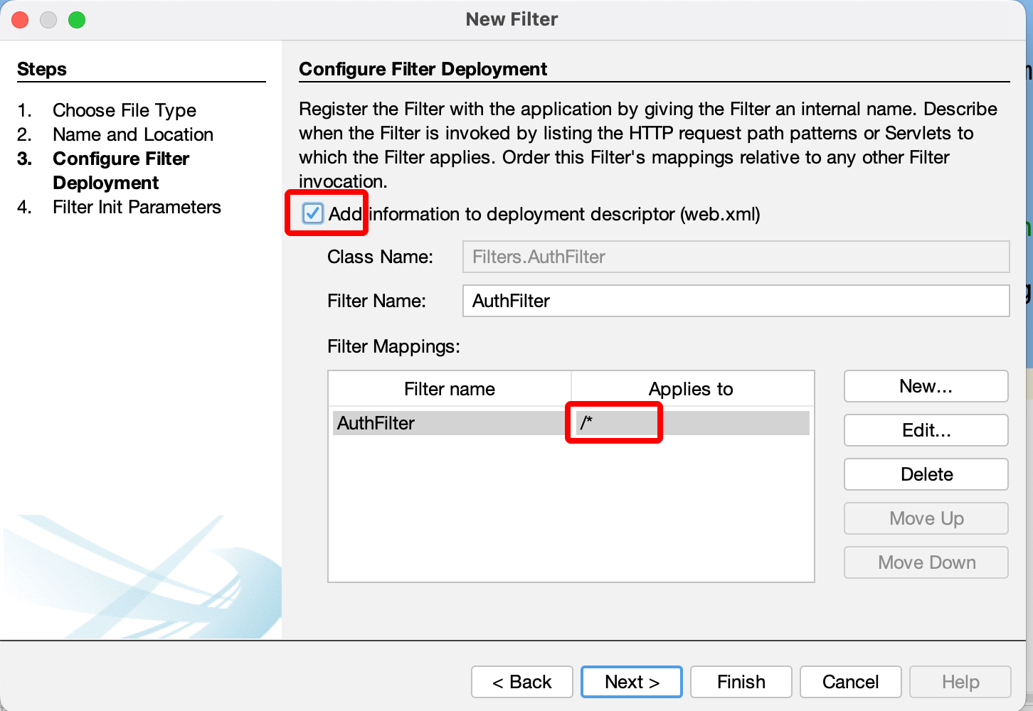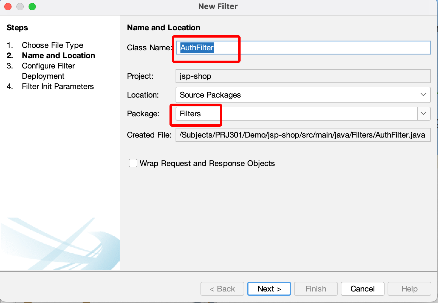 - Fill Class Name (AuthFilter) and Package (Filters)